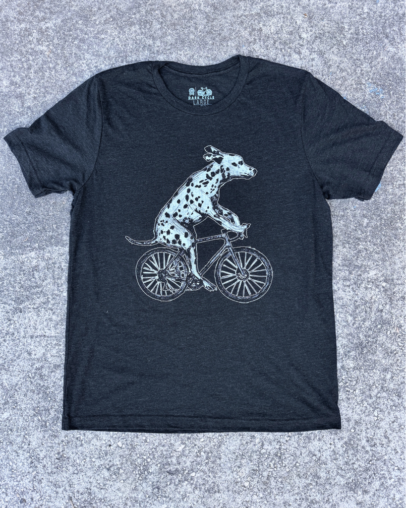 The Design: A hand drawn and printed Dalmatian riding a bike.
