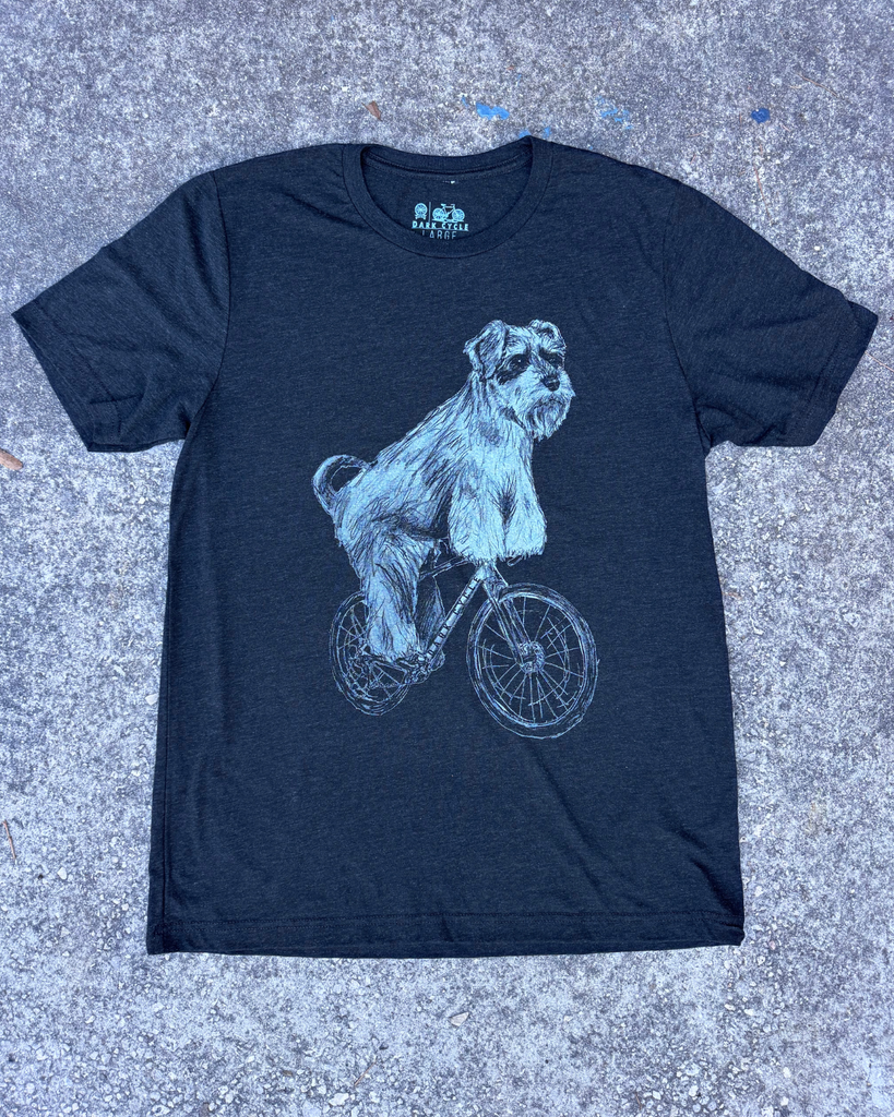 The Design: A hand drawn and printed Schnauzer riding a bike.